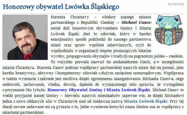 Spotkał mnie olbrzymi zaszczyt, który naprawdę bardzo doceniam. W czwartek, 23 maja, rada naszego polskiego miasta partnerskiego oficjalnie przyznała mi tytuł honorowego obywatela miasta Lwówek Śląski. Rozumiem wielką symbolikę tego gestu, ten wyjątkowy tytuł przyznany był przez polskie miasto obywatelowi Republiki Czeskiej. Tym bardziej, że tytuł został mi oficjalnie wręczony na scenie, przed pełnym widzów rynkiem, podczas XVI Lwóweckiego Lata Agatowego. web: http://www.chrastava.cz/2013/cestny_obcan_lwowek.htm |